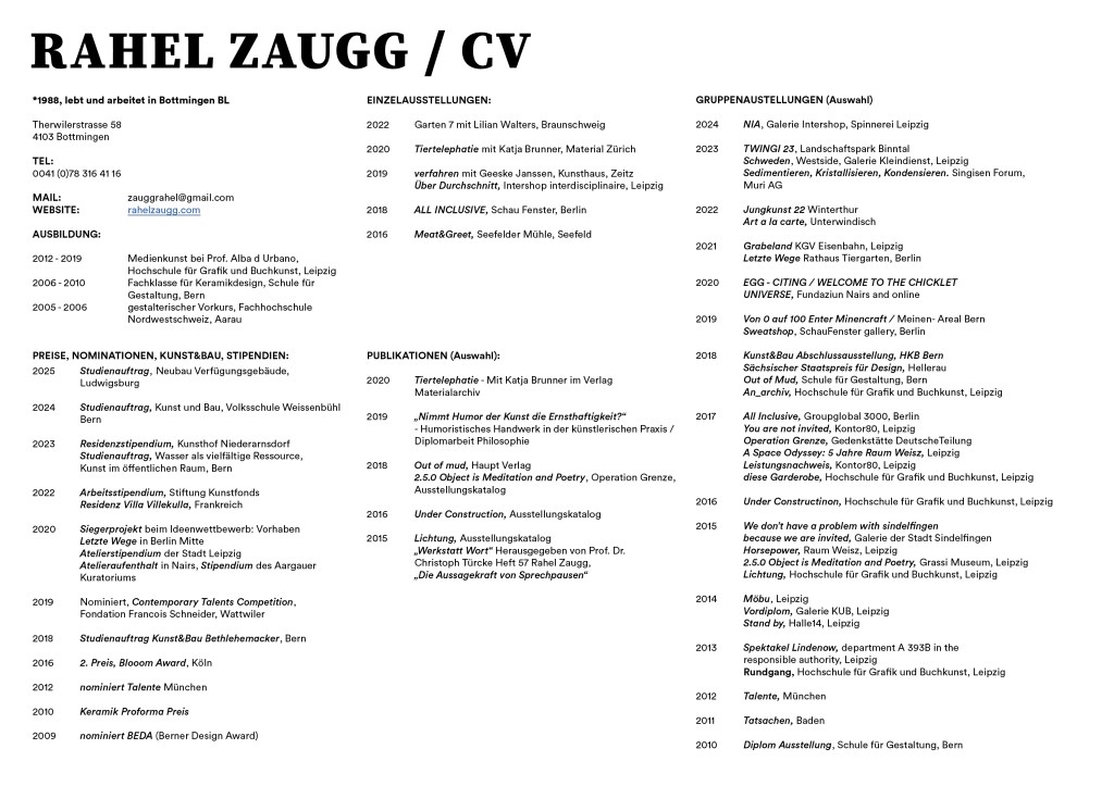 NACH EINER AUSBILDUNG ZUR KERAMIKDESIGNERIN AN DER SCHULE FÜR GESTALTUNG IN BERN, SCHLIESST SIE ANFANG 2019 DAS STUDIUM DER MEDIENKUNST AN DER DER HOCHSCHULE FÜR GRAFIK UND BUCHKUNST IN LEIPZIG AB.